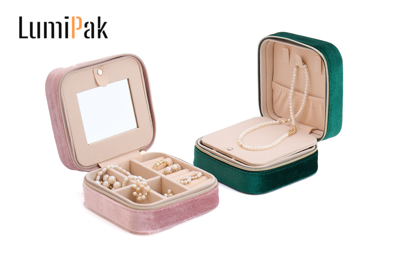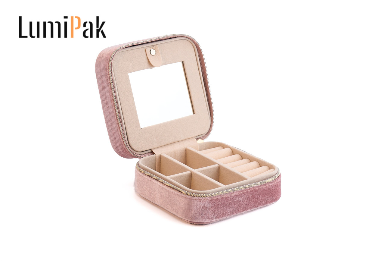 粉色绒面圆角带镜便携首饰收纳盒