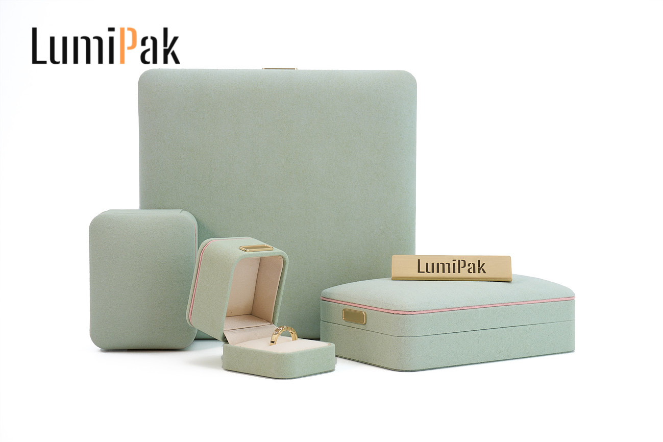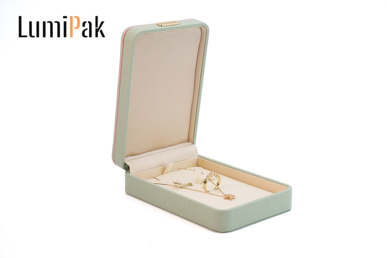 浅绿色金扣绒面圆角套装盒
